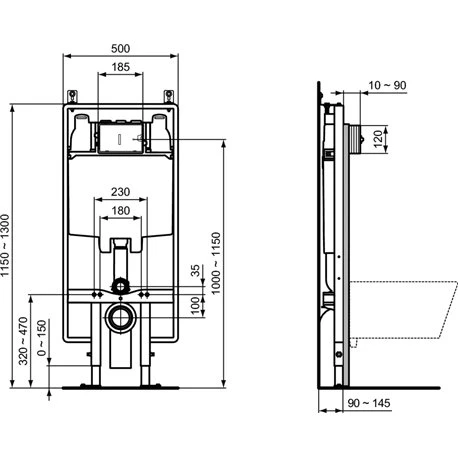 Bâti-support Prosys Porcher. Solution gain de place compatible avec toutes les cuvettes suspendues. Bâti-support mural, mécanique. Hauteur maximum : 1300 mm. Réservoir : 80 mm. Fourni avec un revêtement anti-condensation. Double chasse pré-réglée sur un volume 3/6L. Référence : R014367. Code EAN : 3391500580756