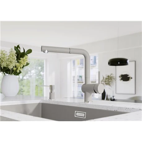 Distributeur de savon Lato Blanco en Silgranit. Distributeur facile à remplir par le dessus avec une contenance de 300ml. Coloris blanc soft/chromé. Diamètre de 35mm pour la découpe. Référence : 526955. Code EAN : 4020684773416