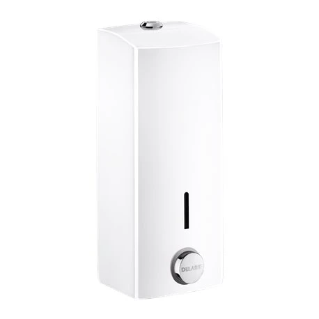 Distributeur de savon liquide 510581 époxy blanc Delabie, modèle antivandalisme avec serrure et clé, capot en inox 304 bactériostatique, caport articulé monobloc, pompe doseuse antigoutte antigaspillage, bouton poussoir à déclenchement souple, antiblocage. Réservoir empêchant la stagnation permanente de savon, fenêtre à contrôle de niveau. Contenance 1 Litre. Epaisseur inox : 1 mm, pour savon liquide et gel hydroalcoolique. Réservoir avec large ouverture. Code EAN: 3456330141864