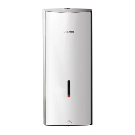 Distributeur électronique de savon 512066P poli brillant Delabie, modèle antivandalisme avec serrure et clé, absence de contact manuel (détection auto des mains par cellule infrarouge), capot en inox 304 bactériostatique, caport articulé monobloc, pompe antigaspillage (dose de 0,8 mL), fonctionnement possible en mode anticolmatage. Alimentation 6 piles fournies AA, indicateur lumineux de batterie faible, fenêtre à contrôle de niveau. Contenance 1 Litre. Epaisseur inox : 1 mm, pour savon liquide et gel hydroalcoolique. Réservoir avec large ouverture. Code EAN: 3456330180085