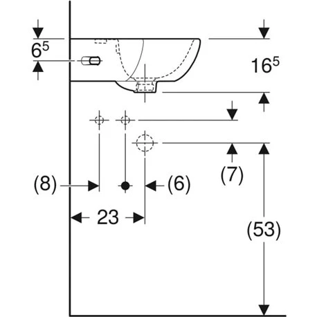 Lave-mains Bastia Geberit avec trop-plein, trou de robinetterie au centre. Référence 501.611.00.1, en céramique, dimensions (hxlxL): 165x400x455 mm, code EAN: 4025410849199