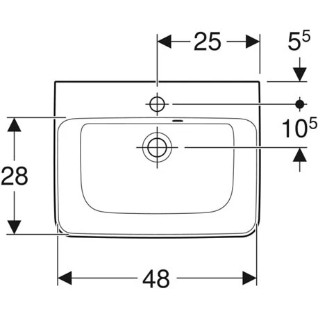 Lave-mains Geberit Renova Plan en céramique avec trop-plein asymétrique, référence 501.628.00.1. Installation possible sur meuble. Trou de robinetterie au centre et avec trop-plein. Dimensions (hxlxL): 165x380x500 mm, code EAN: 4025410858313