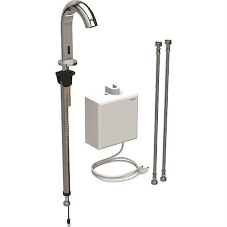 Robinetterie de lavabo Geberit Piave, montage apparent, alimentation sur secteur, avec module fonctionnel apparent, de couleur Chromé Brillant. Matériau : Laiton chromé / Synthétique. Limiteur de débit par mousseur. Avec clapet anti-retour intégré. Livré avec : robinetterie de lavabo avec détecteur infrarouge et flexible de raccordement, module fonctionnel apparent à commande électronique, module fonctionnel et bloc d’alimentation, flexibles à tresse mécanique, clé de verrouillage du mousseur et matériel de fixation. Référence : 116.162.21.1. Code EAN : 4025416833802.