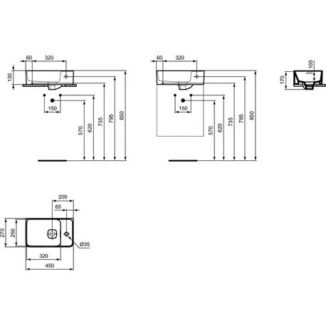 Lave-mains Strada II Ideal Standard. Dimensions (Lxlxh) : 450x270x130 mm. Fixation murale par 2 tire-fonds. Lave-mains version droite en grès fin. Avec trou de trop-plein. 1 trou central pour la robinetterie. Référence : T299401. Code EAN : 8014140448679