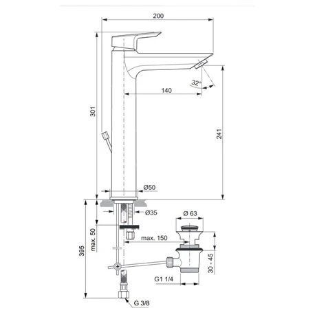 Mitigeur lavabo monotrou A6574AA Tesi réhaussé tirette Ideal Standard. Bec fixe avec aérateur avec limiteur de débit maxi 5 L/min, poignée et rosace d’embase en métal, cartouche diamètre 28 mm à disques céramique avec limiteur de température intégré, Bluestart: ouverture eau froide en position centrale, flexibles d’alimentation anti-torsion 350 mm, système de fixation rapide Easy-Fix, hauteur sous aérateur 241 mm, projection 140 mm. Code EAN: 4015413338387