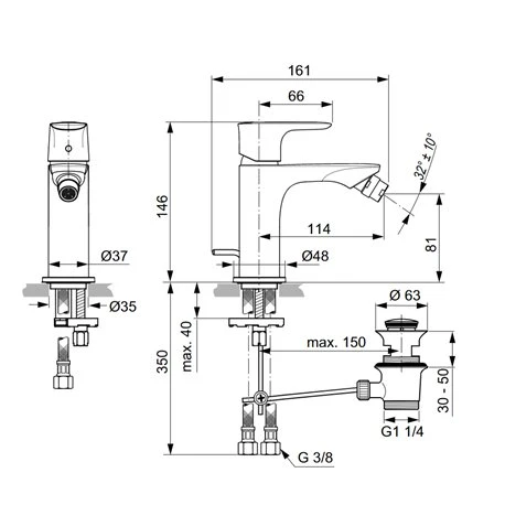 Ideal Standard Robinet Bidet Connect Air Gris Orage, Avec Tirette Et Vidage Bonde Métal