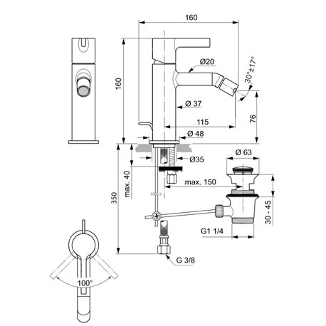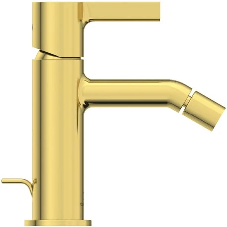 Robinet bidet monotrou BC784A2 Joy or brossé, avec tirette et vidage bonde métal Ideal Standard, bec fixe avec aérateur avec limiteur de débit max 5L/min, cartouche diamètre 28 mm avec limiteur de température, système de fixation rapide easy-fix, hauteur sous aérateur 76 mm, projection 115 mm, code EAN: 3800861086932
