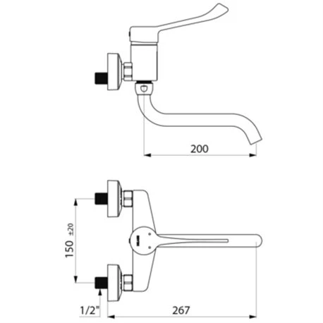 Mitigeur mécanique monocommande mural 2519L à levier, raccords stop/check Delabie, bec tube orientable par-dessous L. 200 mm diamètre 22 mm avec brise-jet étoile laiton, cartouche céramique diamètre 40 mm, bec à intérieur lisse, débit 26 L/min. Code EAN: 3456330117685