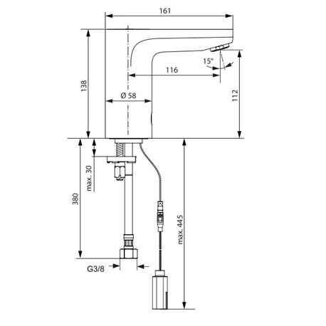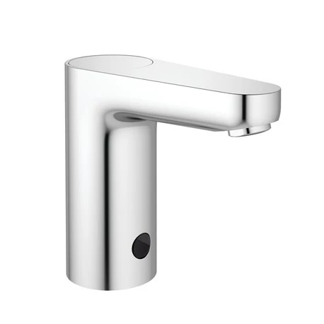 Robinet électronique monofluide sur gorge Okyris, référence D2413AA de Porcher. Cellule de détection infrarouge à la base du corps. Bec fixe avec brise-jet étoilé antibactérien et anticalcaire. Corps et bec fondu en laiton chromé. Clapets anti-retour intégrés. Hauteur sous aérateur de 112 mm, hauteur totale 138 mm. Projection 116 mm. Débit sous 3 bars : 4,7 L/min. Alimentation sur piles 6 V. Code EAN : 4015413333191
