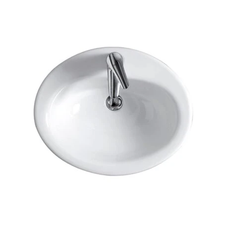 Vasque ovale Aliseo Aquatop. Dimensions (LxlxH) : 500x410x210 mm. Vasque à encastrer sans trop-plein. Poids : 7,7 kg. Avec plage de robinetterie. Référence : SVP620 006.