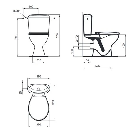 Pack WC à poser au sol Noe prêt à poser avec abattant Porcher. Sortie horizontale sans bride. En porcelaine vitrifiée. Abattant thermodur. Réservoir réversible. Alimentation latérale. Dimensions (HxlxP) : 770x395x655 mm. Référence : P013201. Code EAN : 8014140467724.